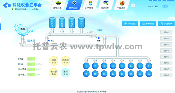可在托普系統(tǒng)云平臺上遠程設(shè)置相應(yīng)的施肥及灌溉日期、使用總量、工作時長等參數(shù),實現(xiàn)區(qū)域用水、用肥的計量管理;現(xiàn)場安裝的360°遠紅外球形攝像頭能夠清晰直觀的看到基地的葡萄長勢和周圍的環(huán)境;還可對灌溉設(shè)施設(shè)備生成定期維護計劃,記錄維護情況,實現(xiàn)灌溉工程的精細化維護運行管理。不僅能夠充分發(fā)揮現(xiàn)有的節(jié)水設(shè)備作用,優(yōu)化調(diào)度,提高效益,更加節(jié)水節(jié)能,降低灌溉成本,提高灌溉質(zhì)量,將使灌溉更加科學(xué)、方便,提高管理水平。