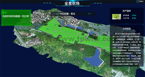 作為智慧農(nóng)業(yè)的升級版本,“超級農(nóng)場”項目對生產(chǎn)經(jīng)營管理等每一個環(huán)節(jié),都進行了嚴格的監(jiān)管,數(shù)據(jù)采集,實時監(jiān)測。通過無人機的航拍,實現(xiàn)了對整個農(nóng)場的3D建模,把整個農(nóng)場分成A—K,差不多11個區(qū)塊,然后進行區(qū)塊的數(shù)字化監(jiān)控。一塊電子顯示屏就可看到農(nóng)場的所有狀況,葡萄園11個鋼架大棚所有環(huán)境信息,包括溫度、濕度、土壤酸堿值、光照等情況都呈現(xiàn)在屏幕上。另外,葡萄園里各處分布了多少攝像頭,有多少在職人員,多少外來人員,也都能一目了然。