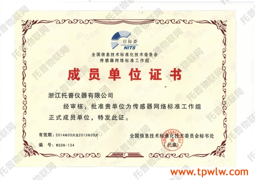 圖為:國家傳感器網(wǎng)絡(luò)標準工作組成員單位證書