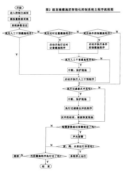 營養液施肥控制方式也分為人工干預、定時定量、條件控制 種。當進行營養液施肥時,計算機系統根據選定的配方和已設定好的營養液pH、EC值,利用文丘里注肥器進行水肥混合,同時在線實時監測混合營養液的pH、EC值,根據pH、EC設定值與檢測值之間的偏差來調整混肥閥的注肥頻率,在短時間內使營養液的檢測值和設定值之差達到允許的范圍內。當一組田間閥門施肥結束時.先打開下一組閥門,再關閉正在運行的閥門。當所有需要施肥的田間閥施肥完畢,先關閉施肥泵和水泵,再關閉正在打開的所有閥門,結束施肥控制。