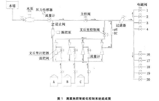 滴灌施肥智能化控制系統由中心控制計算機、系統首部裝置、田間電磁閥和控制電纜、滴灌管網系統組成。系統組成見圖1。