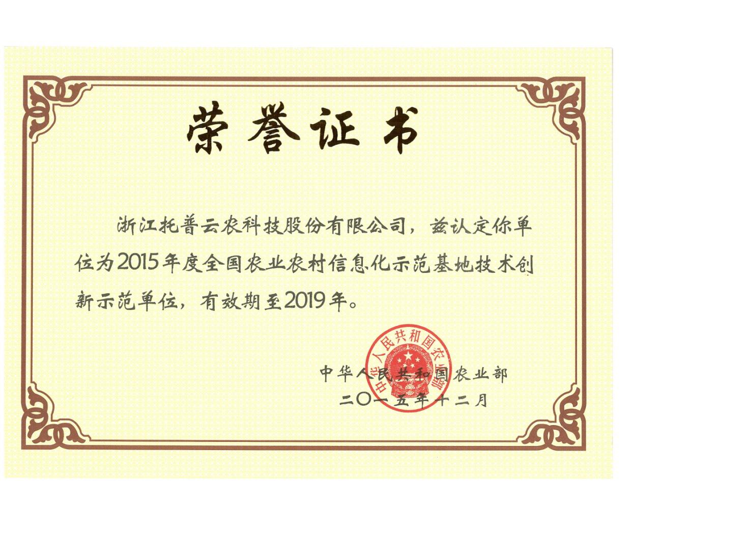 2015年12月9日,農業部發文公布《農業部關于認定2015年度全國農業農村信息化示范基地的通知》,浙江托普云農科技股份有限公司獲批技術創新型示范單位?!锻ㄖ芬蟾魇痉痘兀謩撔?、協調、綠色、開放、共享的發展理念,積極推進“互聯網+”現代農業行動,大力發展農業,切實抓好農業電子商務、農業物聯網、農業農村大數據、農業信息服務等重點工作,大膽探索創新,充分發揮示范引領作用,為推進農業現代化作出新貢獻。