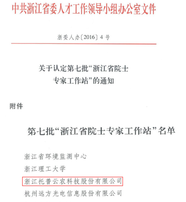 7月25日,中共浙江省委人才工作領(lǐng)導(dǎo)小組辦公室公布了第七批“浙江省院士專家工作站”名單,此次共有22家單位上榜,杭州市2家。浙江省托普云農(nóng)科技股份有限公司(以下簡(jiǎn)稱“托普云農(nóng)”)成為浙江農(nóng)業(yè)信息化領(lǐng)域內(nèi)第一家獲此殊榮的企業(yè)。