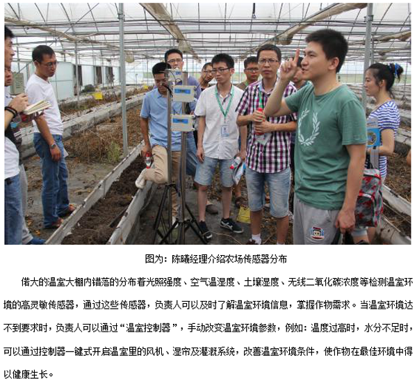 喬司農(nóng)場是浙江省首家集規(guī)模種植、科研生產(chǎn)、網(wǎng)絡(luò)銷售、宅配服務(wù)為一體的國家級農(nóng)業(yè)綜合開發(fā)綠色蔬菜生產(chǎn)基地。2014年4月中旬,托普物聯(lián)網(wǎng)系統(tǒng)在喬司農(nóng)場成功搭建運行。 隨后的8月2日,銷售部全體員工在時任營銷經(jīng)理陳曦的帶領(lǐng)下前往喬司農(nóng)場,觀看農(nóng)場內(nèi)的物聯(lián)網(wǎng)系統(tǒng)運行情況。