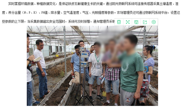 在《陽光物聯(lián)網(wǎng)引領(lǐng)仙草(鐵皮石斛)種植新方式》一文中,不僅“學(xué)習(xí)”物聯(lián)網(wǎng)系統(tǒng)的建設(shè)原理,以及操作方式外,還引用當(dāng)時參觀時拍攝的圖片。為了降低圖片的辨識度,還對圖片進(jìn)行模糊處理。