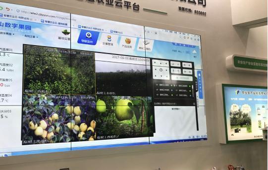 巨型的顯示大屏上,即時閃動著果園的光照度、空氣溫濕度、土壤溫濕度,攝像頭連上傳感器,向“中樞”傳送著每顆果實的最新生長情況。