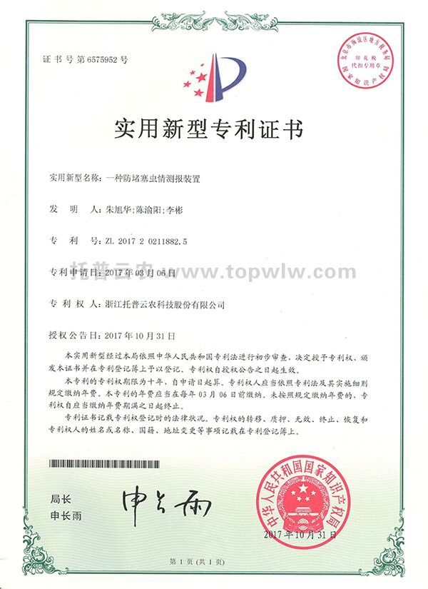 - 蟲(chóng)情測(cè)報(bào)取得新突破!托普云農(nóng)獲國(guó)家實(shí)用新型專(zhuān)利發(fā)表日期:2017-12-15 來(lái)源:托普云農(nóng) 瀏覽次數(shù):5092次