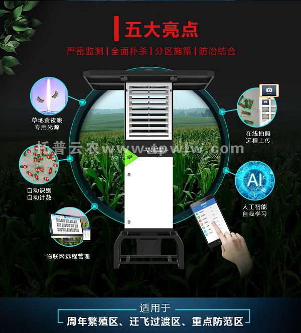 為了預防草地貪夜蛾的入侵,必須用測報燈做好監測。托普云農研發的智能蟲情測報燈全新升級重磅上線,具有AI人工智能自我學習功能,采用草地貪夜蛾專用光源,可自動識別自動計數,真正做到嚴密監測,全面撲殺。在線拍照遠程上傳,可通過Web或APP隨時隨地聯網管理。