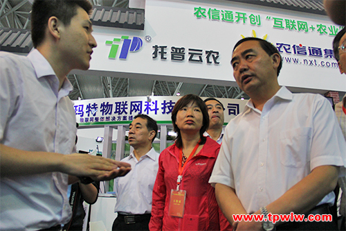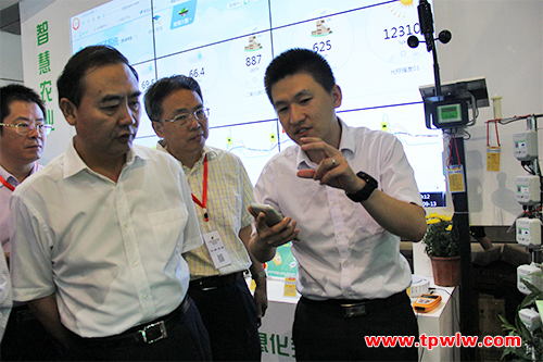 會(huì)議期間,安徽省農(nóng)業(yè)委員會(huì)孫正東主任蒞臨托普云農(nóng)農(nóng)業(yè)物聯(lián)網(wǎng)展區(qū),并細(xì)致觀摩了托普云農(nóng)所展出的大田“四情”監(jiān)控系統(tǒng)、設(shè)施農(nóng)業(yè)監(jiān)控系統(tǒng)、土壤墑情監(jiān)控系統(tǒng)等多種農(nóng)業(yè)物聯(lián)網(wǎng)綜合服務(wù)平臺(tái),以及與之相關(guān)的多種儀器和智能硬件設(shè)備。在參觀過(guò)程之中,孫正東主任詳細(xì)詢問(wèn)了大田“四情”監(jiān)控系統(tǒng)、遠(yuǎn)程傳輸智能蟲(chóng)情測(cè)報(bào)燈、植物本體傳感器、固定式無(wú)線農(nóng)業(yè)氣象綜合監(jiān)測(cè)站等系統(tǒng)設(shè)備。陳曦經(jīng)理為其一一進(jìn)行介紹。